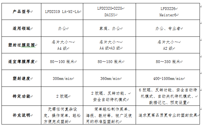 塑封膜片材用的小型塑封机和塑封膜卷材用的大型自动塑封机,均为日本原装生产,型号齐全,包括PLS3310、PLS3311及LPD3226型,主推机型为LPD3226。该塑封机可以轻松对照片、证卡及文件资料等进行塑封加工。经过塑封加工的照片、证卡及文件资料具有光泽美观、耐水性、耐磨性等优点。可塑封幅度从名片大小至A2、塑封膜的厚度30微米至359微米。该产品塑封速度快,轻盈便捷适合各种环境使用。